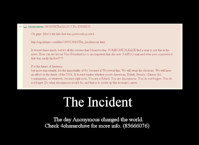 In the past couple days news had come to light about palin using a yahoo mail account, it was in news stories and such, a thread was started full of newfags trying to do something that would not get this off the ground, for the next 2 hours the acct was locked from password recovery presumably from all this bullshit spamming.