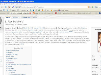 I know I should not be encouraging the Wikipedia vandals, but sometimes the vandals are so goddamn right that it is almost impossible not to let out a little cheer when they hit the nail on the head. I was doing some reading on Scientology when I happened to click on a link to the Wikipedia article for the famous fraud L. Ron Hubbard. That was when I saw this: