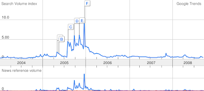 Just when we thought that DaveScot may have finally decided to make a teeny bit of sense after all, he ends up crashing our hopes to the ground by posting something so mind-numbingly ridiculous; making us realize that his drama is a train wreck that we simply cannot stop watching. Over at Uncommon Descent, he decides to have a little fun with Google Trends:
